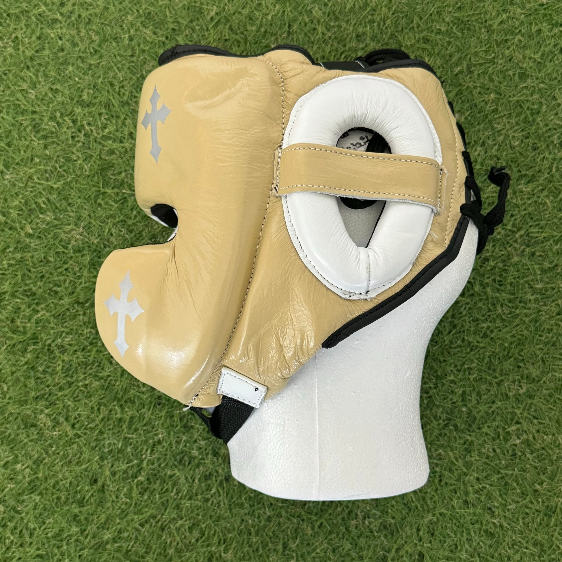 HM CRUCIFIX CREAM & WHITE BOXING HEADGEAR | 100% LEATHER